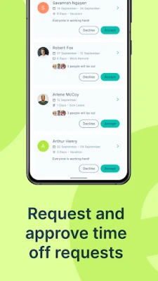 - Display internal structure and roles to your team. Help everyone know each other. - Collect and set up employees' data in one place, and finally, forget sheets and tables. - Request and Manage Time Off requests with a single tap. - Organize your working days with an absence calendar. - Schedule company holidays and important dates. Introduce Holiday/Vacation Policy to employees. - Be on track with birthdays and celebrations in the company. Help people celebrate!