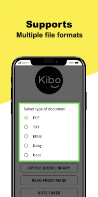 Kibo provides an end-to-end content accessibility platform and makes reading-learning inclusive for all (including the blind, low-vision and visually-impaired people) while supporting 60+ international languages and 11 file-formats including PDF, TXT, EPUB, Daisy, DOCX, JPG, JPEG, PNG, MP3, OPUS, OGG. Not just that, you can use it as an audio player and even access over 1 Million+ books from our digital library partners.