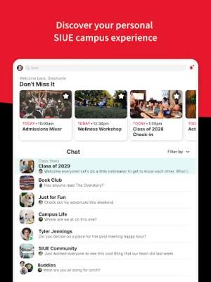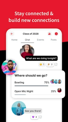• Discover and explore new communities and meet other students through messaging, events, polls and more.